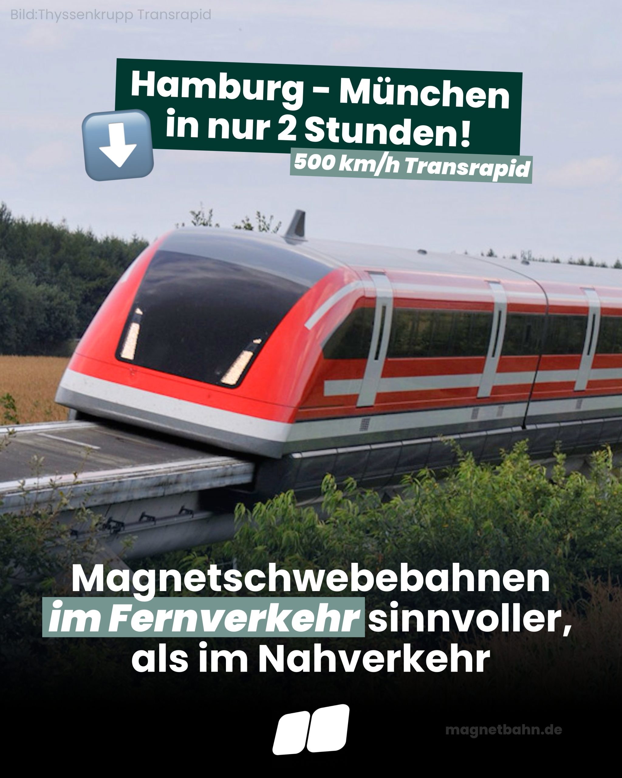 Anders sieht es im Fernverkehr aus. Hier würde eine 500 km/h Magnetschnellbahn vollkommen neue Mobilitätserlebnisse ermöglichen, Reisezeiten durch Deutschland und Europa auf ein Bruchteil der Zeit reduzieren, Energie-, Wartungs- und Betriebskosten massiv senken, auf eigener Infrastruktur mit maximaler Zuverlässigkeit verkehren und vorallem: den Fernverkehr auf Straßen, Schienen und Luftverkehr extrem entlasten.