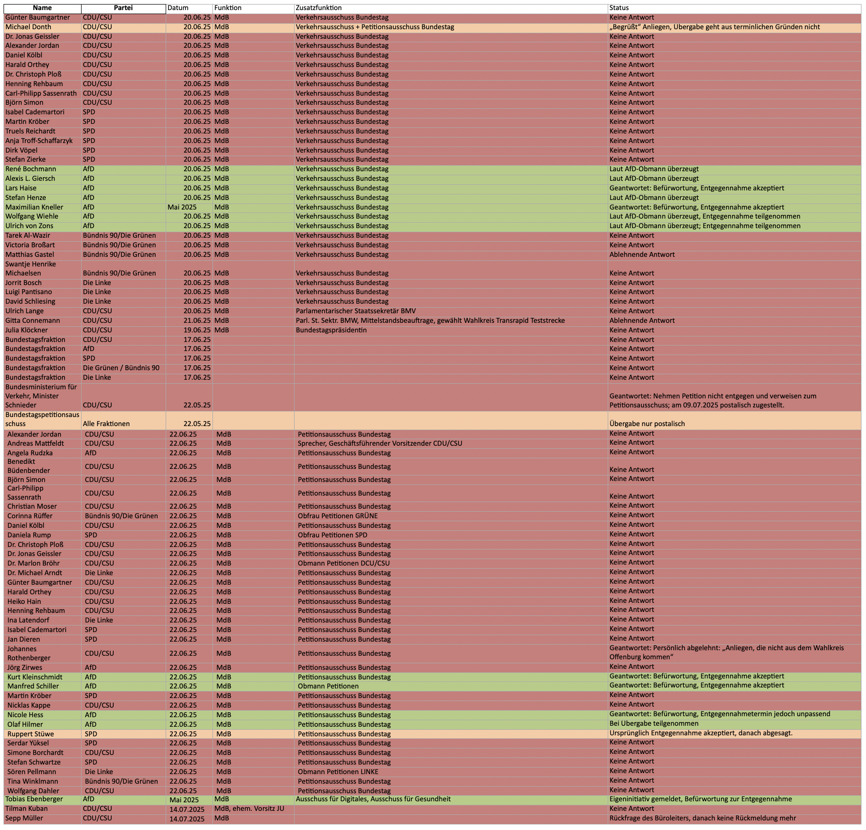 Sämtliche im Deutschen Bundestag vertretenen Fraktionen sowie alle Mitglieder des Verkehrs- und Petitionsausschusses wurden kontaktiert und zu einer Übergabe eingeladen. Das Ergebnis war eindeutig: Der überwiegende Teil der Abgeordneten reagierte überhaupt nicht oder lehnte ausdrücklich ab.